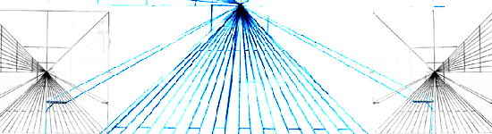1. Zu Beginn der Zeichenstunde haben wir unsere Dia-Experimente auf Papier betrachtet und besprochen. Sie wurden von Jörg in den Computer eingescannt und auf Fotopapier gedruckt. 2. Danach haben wir einen Tonwertverlauf gezeichnet, von dunkel nach hell. Dazu haben wir ein nach rechts offenes Rechteck gezeichnet und es mit Schraffurlinien gefüllt, von links angefangen. 3. Zunächst haben wir mit dem weichsten Bleistift ein Viertel der Rechteckfläche schraffiert. Dann haben wir mit einem zwei Stufen härteren Bleistift darüber schraffiert. Dabei wurde wieder ganz links angefangen und etwa bis zur Hälfte des Rechtecks schraffiert. 4. Auf diese Art und Weise haben wir insgesamt vier Bleistifte in verschiedenen Härtestufen verwendet, so dass ein Tonwertverlauf entstanden ist. Wichtig dabei ist, dass die Schraffurlinien bei jedem Bleistift im Winkel etwas versetzt angelegt werden. 5. Anschließend haben wir uns wieder mit der Perspektive beschäftigt. Dazu sind wir mit einer großen rechteckigen weißen Leinwand in den Hof gegangen und haben uns in einiger Entfernung davor hingestellt. Die Leinwand stand zunächst im rechten Winkel zu unserer Blickrichtung, so dass wir die gesamte Fläche sehen konnten. 6. Dann haben wir die Breite und Höhe der Leinwand mit weißen Holzleisten markiert und festgehalten. Jetzt wurde die Leinwand in einem 45 Grad Winkel nach hinten gedreht. Wir konnten dabei feststellen, dass die sichtbare Fläche kleiner wurde. 7. Wir konnten ebenfalls feststellen, dass die in die Tiefe führenden Linien von der in der Frontalansicht markierten Breite der Leinwand abwichen und schräg verliefen. 8. Dieser Effekt wird in der Zeichnung durch die so genannten Fluchtlinien konstruiert. Die Fluchtlinien laufen auf einen „imaginären“ Fluchtpunkt zu, wie wir es bei der Zentralperspektive bereits kennen gelernt hatten. 9. Zum Schluss haben wir wieder gezeichnet, dieses Mal eine Perspektive mit zwei Fluchpunkten. Diese Perspektivische Darstellung wird auch „Eckperspektive“ genannt. 10. Wir haben drei verschiedene Skizzen mit Eckperspektiven gezeichnet, jede mit anderen Fluchtpunkten. In einem der dabei entstandenen Kuben haben wir einen Tonwertverlauf angelegt. |